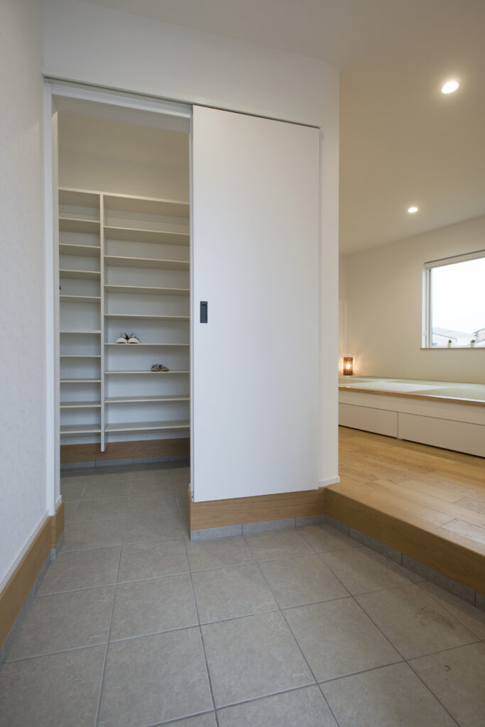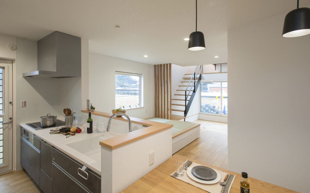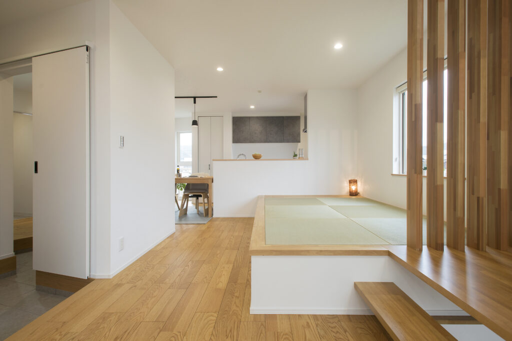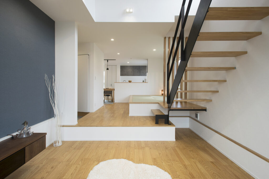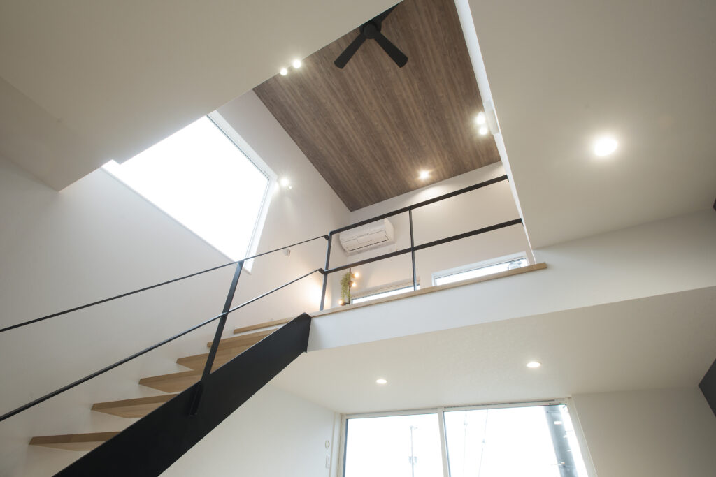 ダウンリビングや吹き抜けなど、楽しさと好きを詰め込んだV字型×7層から生まれる伸びやかな縦空間を生かした設計。 吹き抜け×ダウンリビング×スキップフロアの遊び心溢れる楽しい広々空間。