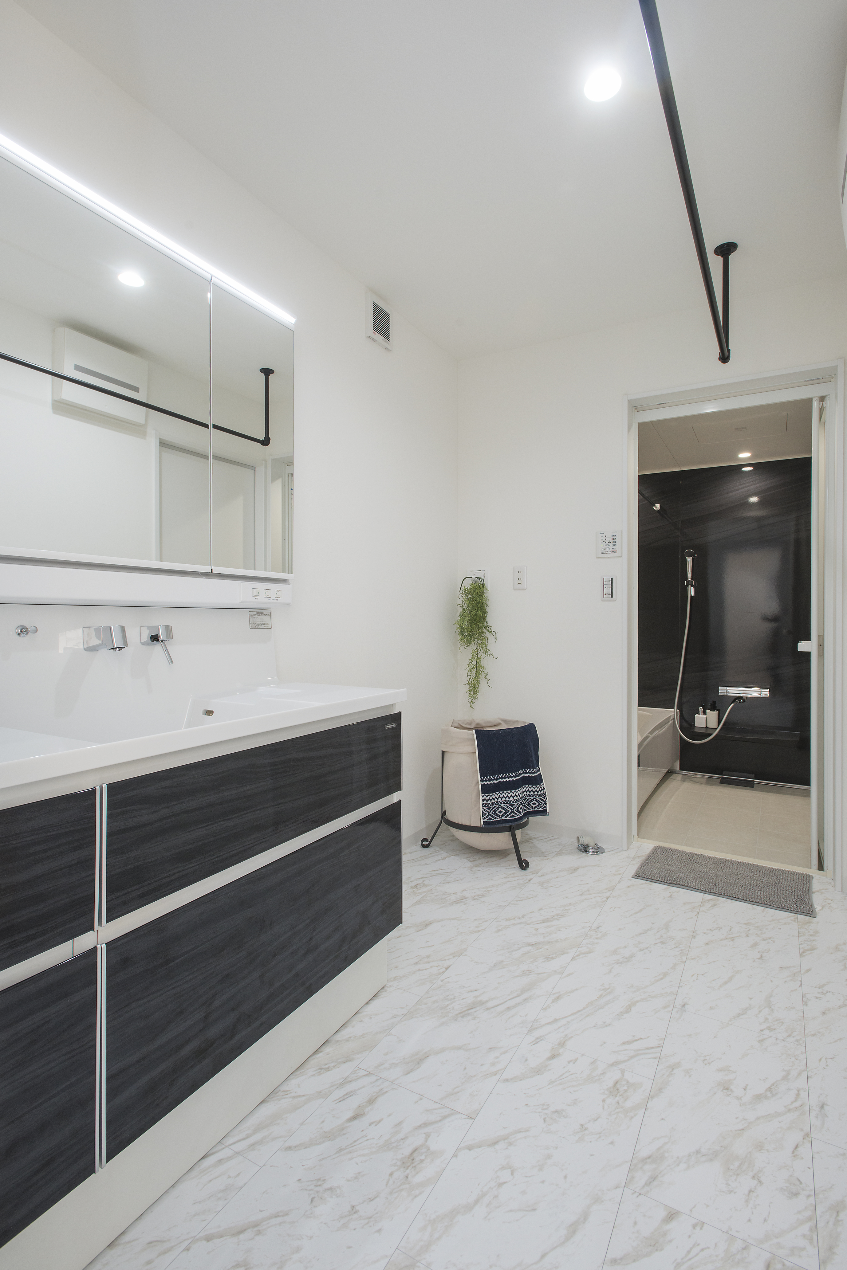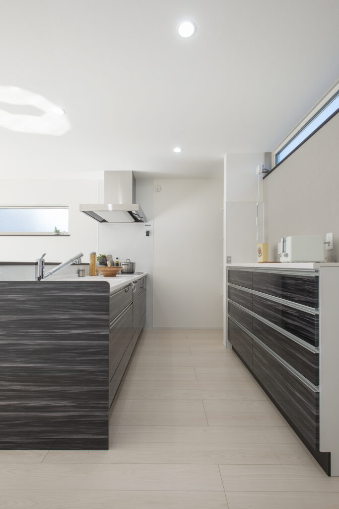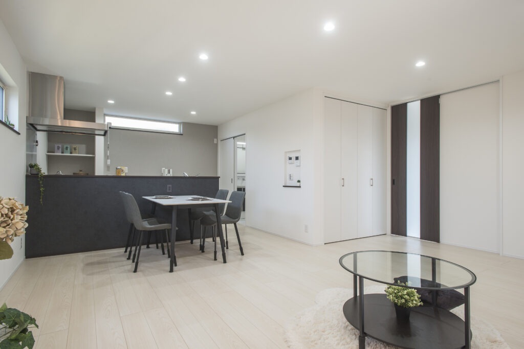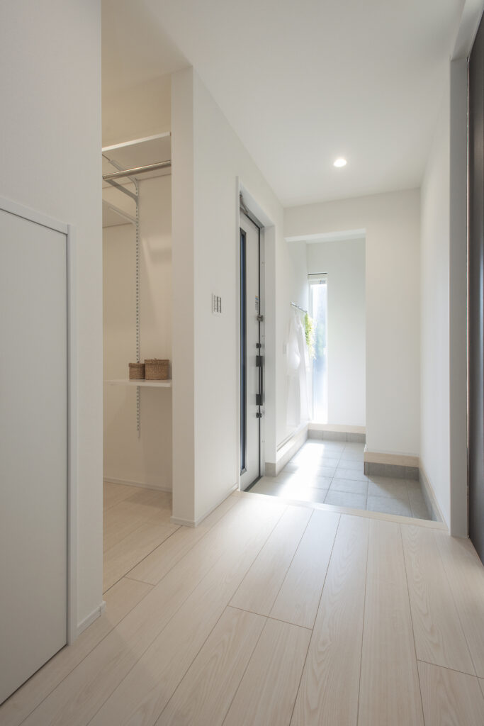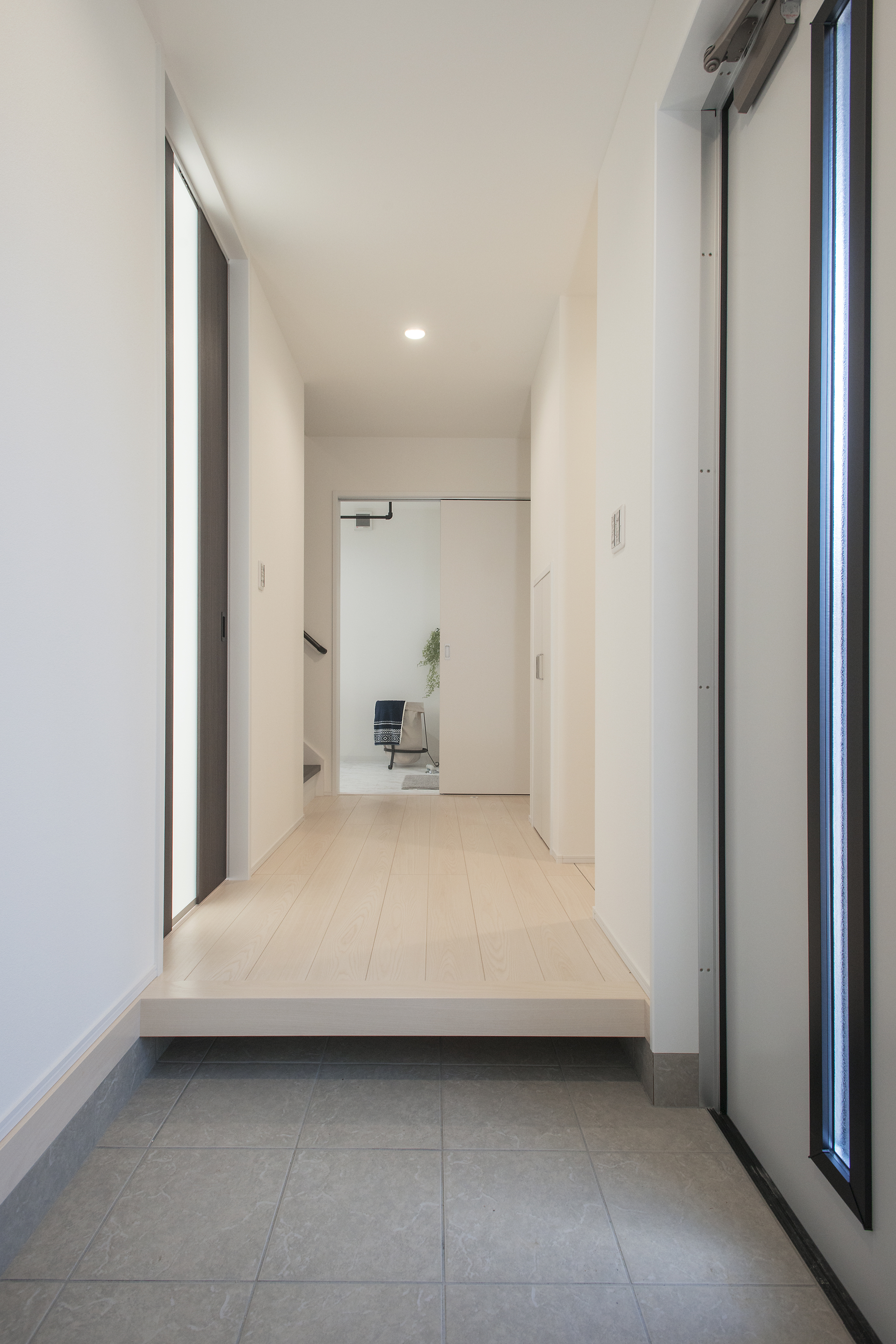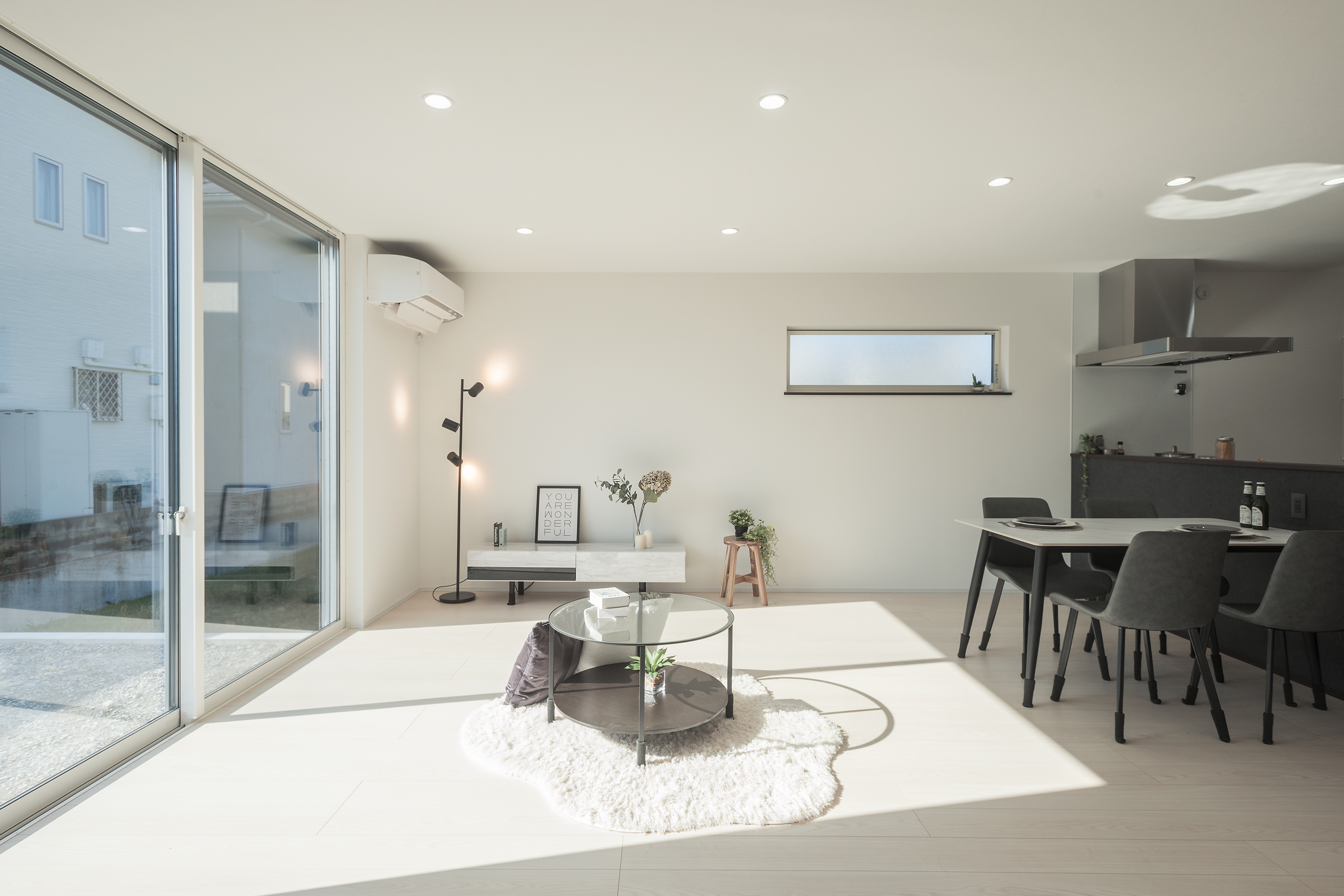 天井まであるハイドア&ハイサッシで明るく開放的。 家族の様子が見えるキッチン腰壁や広々ワイドな玄関ホール。 家事動線に沿った使いやすい水まわりで毎日の暮らしがちょっとラクになる間取り。