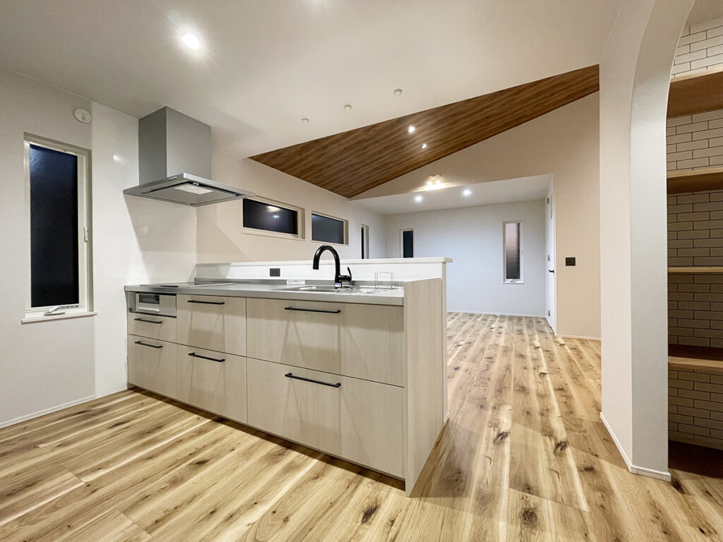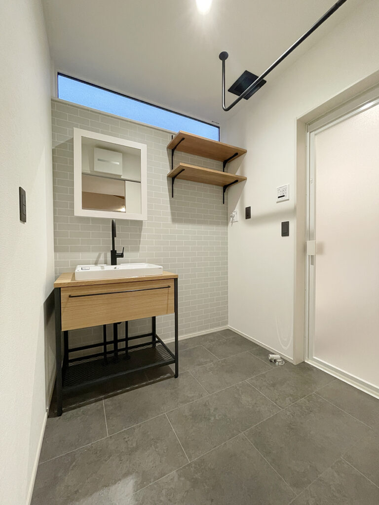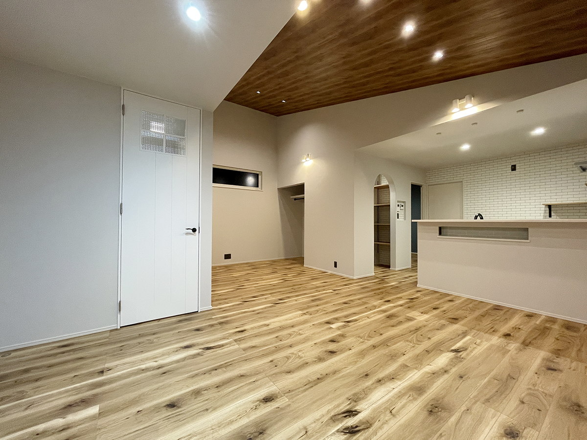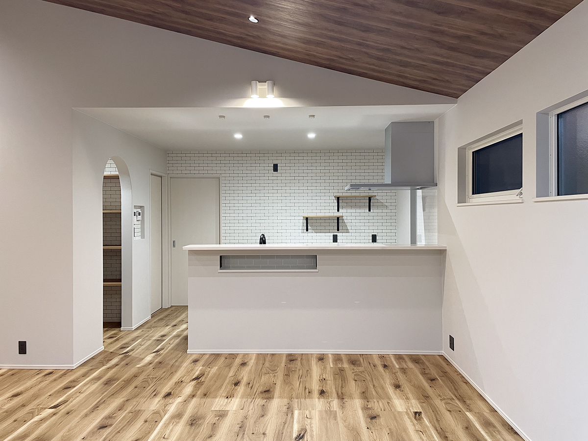 規格住宅をベースに、 ニッチや勾配天井で空間にアクセントを。 気分が上がる、造作洗面台やドア、壁紙。 こだわる場所を決める家づくり。